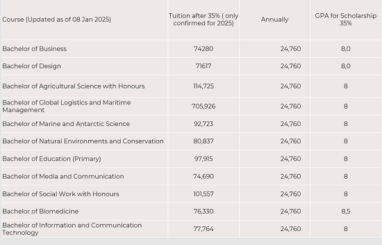 Chỉ với yêu cầu GPA lớp 12 từ 8.0 đối với bậc cử nhân và GPA 7.0 đối với bậc thạc sĩ + hoàn tất thủ tục hồ sơ trước ngày 30/04/2025 là các bạn đã có cơ hội nhận được học bổng 35% (cấp cho toàn bộ chương trình) tại University of Tasmania. Hiện tại học bổng cao nhất này chỉ áp dụng cho kỳ tháng 07/2025. So với nhiều trường đại học khác của Úc, điều kiện này tương đối dễ dàng, giúp giảm đáng kể học phí hàng năm.