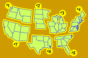 Số 1 trên bản đồ là khu vực Tây Bắc, bao gồm các bang Idaho, Montana, Oregon, Washington, và Wyoming. Khu vực này thường có mùa đông khá mát và ẩm ướt đối với những nơi gần bờ biển, mát và khô trong đất liền, và hay có tuyết dày đặc và lạnh lẽo trên đồi núi. Thời tiết mùa hè thì mát và khô hơn so với phần lớn phần còn lại của nước Mỹ. Điều này có thể được lý giải bởi việc biển Thái Bình Dương góp phần làm mát không khí, đặc biệt ở những chỗ gần bờ. Khu vực này có nắng nhiều nhất trong năm trong các tháng hè.