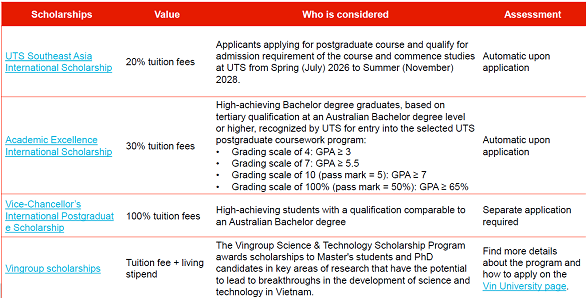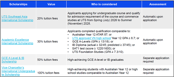 - 20% - UTS Academic Merit Intl Scholarship: Học sinh chỉ cần đáp ứng điều kiện đầu vào của UTS