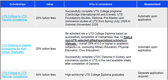 - 20% - Diploma to Degree Pathway Scholarship: Dành cho học sinh học các chương trình diploma lên cử nhân, học sinh chỉ cần đáp ứng điều kiện đầu vào của UTS